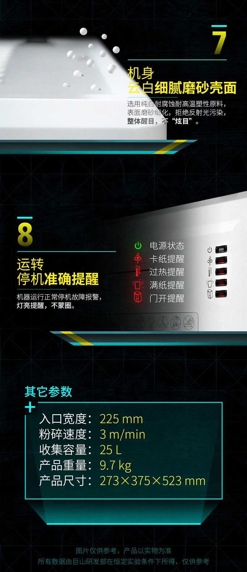 粉碎速度:3 m/min  紙箱容積:25 L  產(chǎn)品重量:9.7 kg   機(jī)器尺寸:375×273×523 mm  切割器3年質(zhì)保 門開滿紙過自動(dòng)停機(jī) 風(fēng)冷系統(tǒng)工作持久