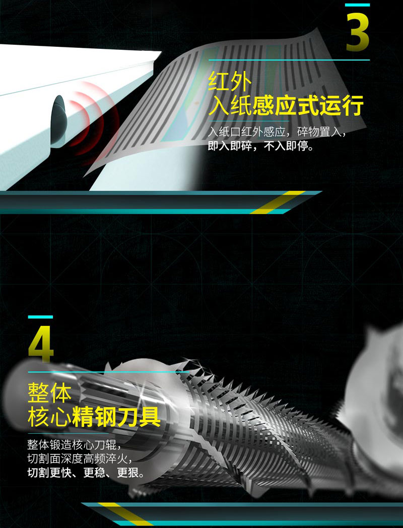 24小時持續(xù)粉碎 切割器5年質(zhì)保 門開滿紙過自動停機(jī) 風(fēng)冷系統(tǒng)工作持久 整體鋼刀耐用持久 具有過熱停機(jī)保護(hù) 卡紙自動反轉(zhuǎn)保固