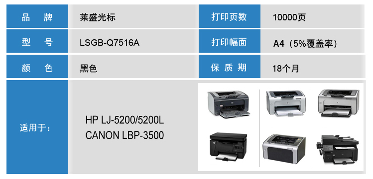 萊盛光標(biāo) LSGB-Q7516A 黑色粉盒 適用:HP LJ-5200/5200L CANON LBP-3500 單位:支