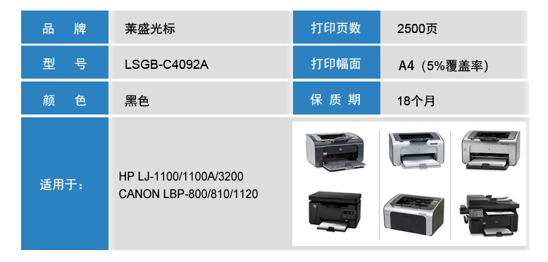 萊盛光標(biāo) LSGB-C4092A 黑色粉盒 適用:HP LJ-1100/1100A/3200 CANON LBP-800 單位:支