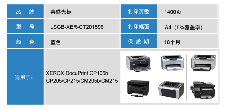 萊盛光標 LSGB-XER-CT201596 青色粉盒 適用:XEROX DocuPrint CP105b/CP205 單位:支