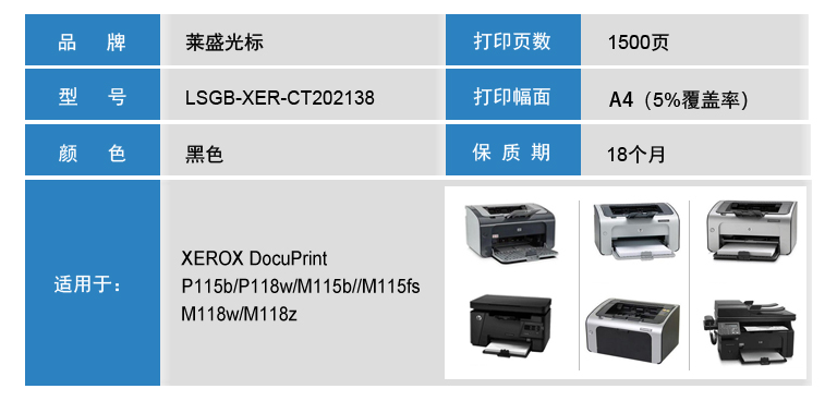 萊盛光標 LSGB-XER-CT202138 黑色粉盒 適用:XEROX DocuPrint P115b/P118w 單位:支