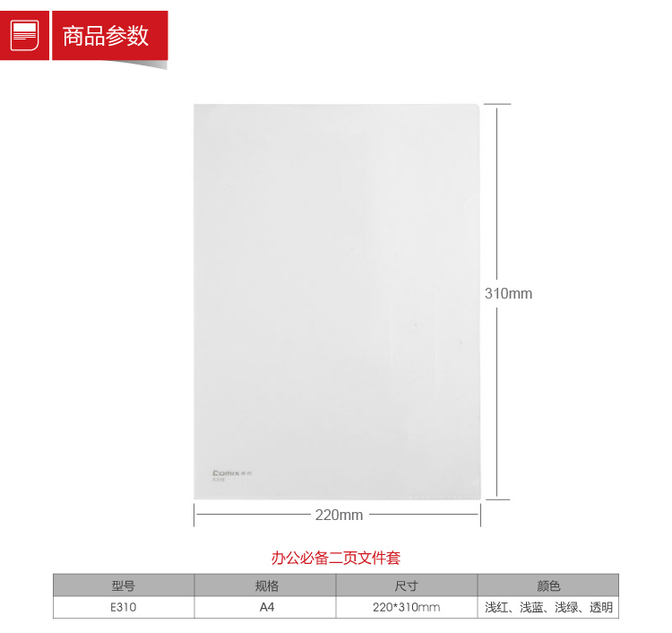 商品名稱:齊心 E310 辦公必備二頁(yè)文件套 A4  基本單位:10個(gè)/包