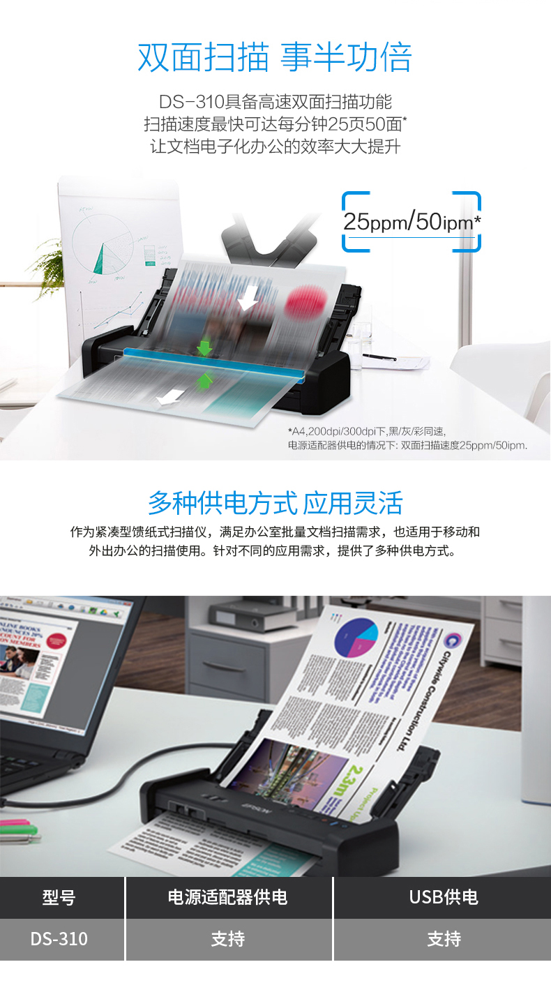 愛普生掃描儀 DS-310 緊湊型A4饋紙式掃描儀高速雙面 單位:臺