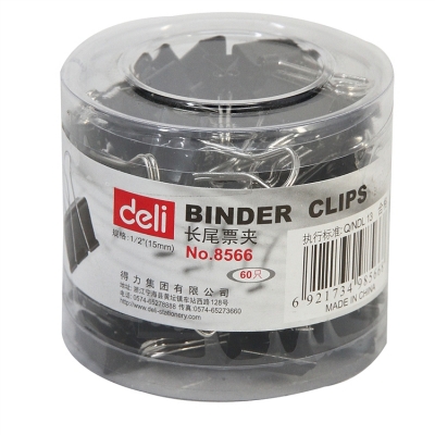 商品名稱:得力(deli)8566 6#黑色長尾夾/長尾票夾15mm 60只/筒