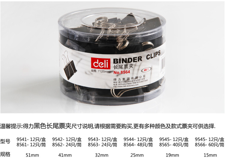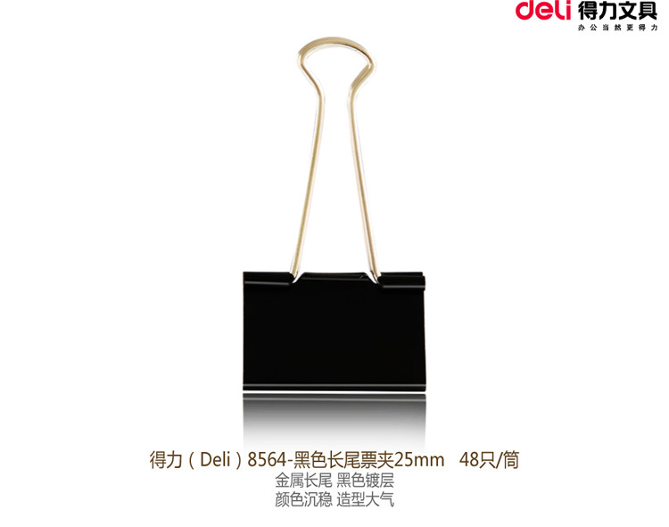 商品名稱:得力8564 4#黑色長尾夾/長尾票夾25mm 48只/筒