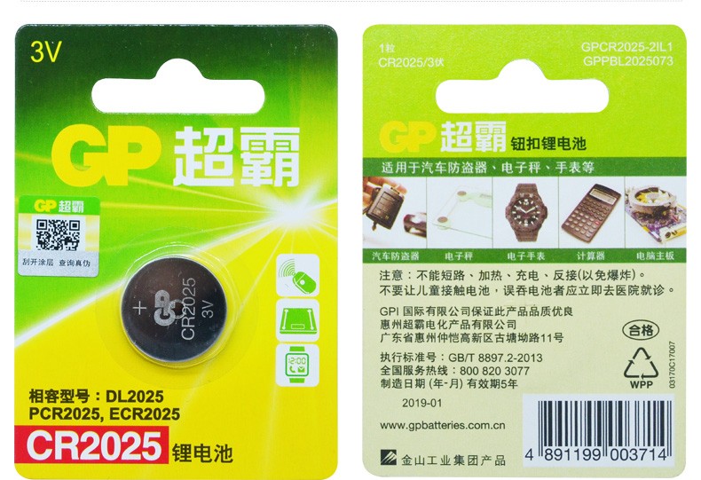 超霸電池 CR2025紐扣電池2粒 單位:卡