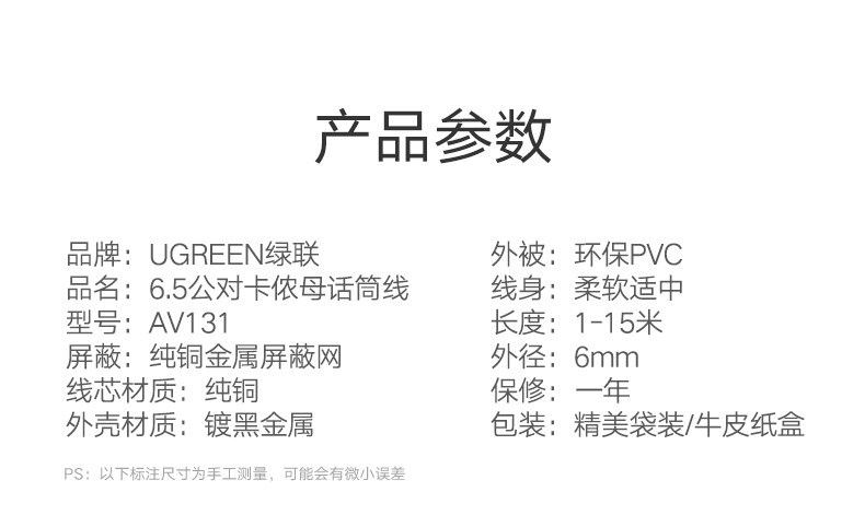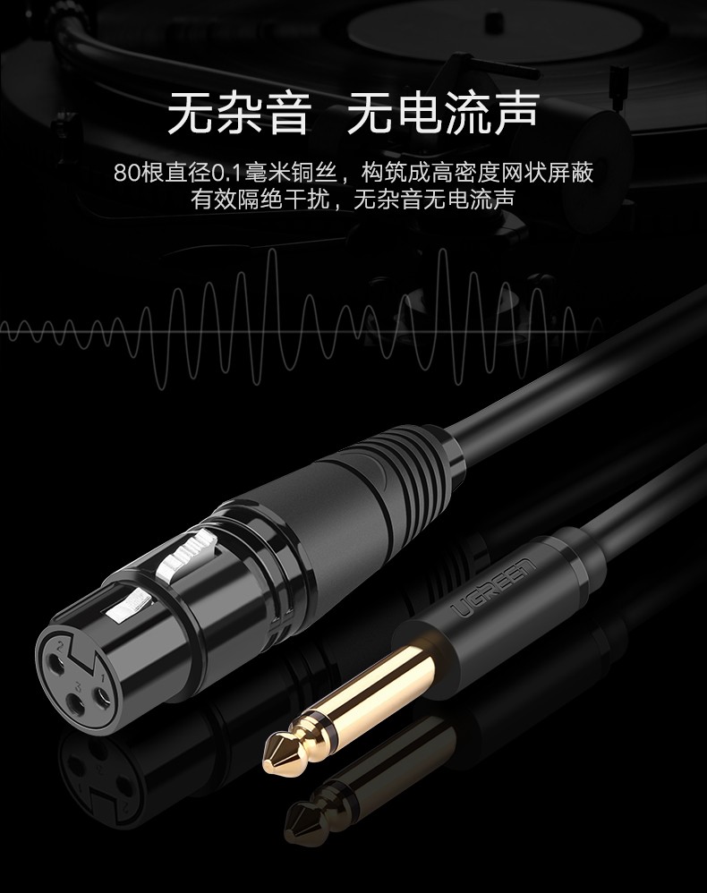 綠聯(lián) AV131 6.5mm轉(zhuǎn)卡農(nóng)公對母話筒音頻線 6.35卡儂口XLR平衡線 麥克風(fēng)調(diào)音臺音響箱功放連接線 2米 黑色 單位:根