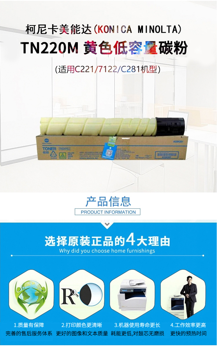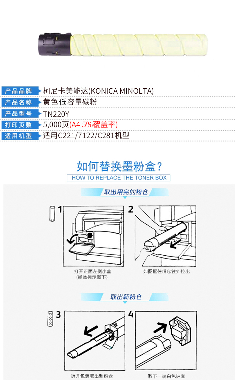 柯尼卡美能達 TN220Y 黃色粉盒 低容 適用柯美C221S/C221/C281/C7122/C712復合機 單位:支