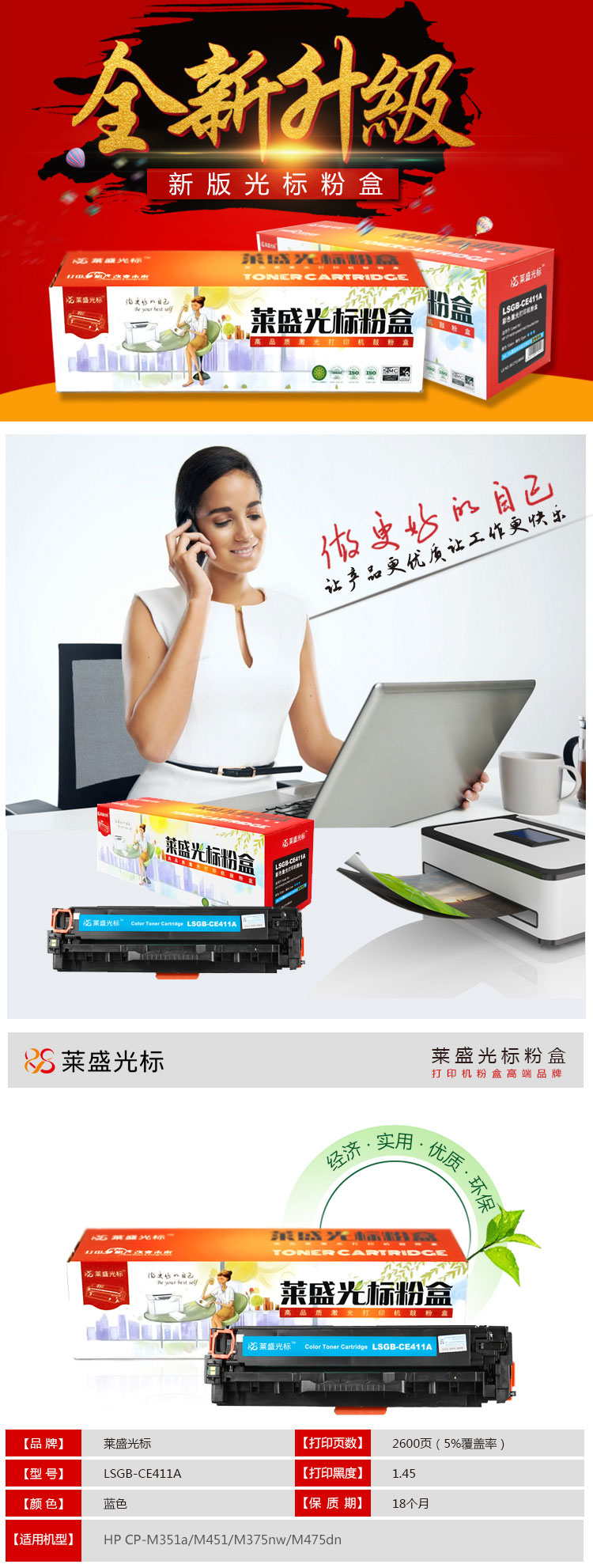 萊盛光標(biāo) LSGB-CE411A 青色粉盒 適用 HP CP-M351a/M451/M375nw/M475dn 單位:支