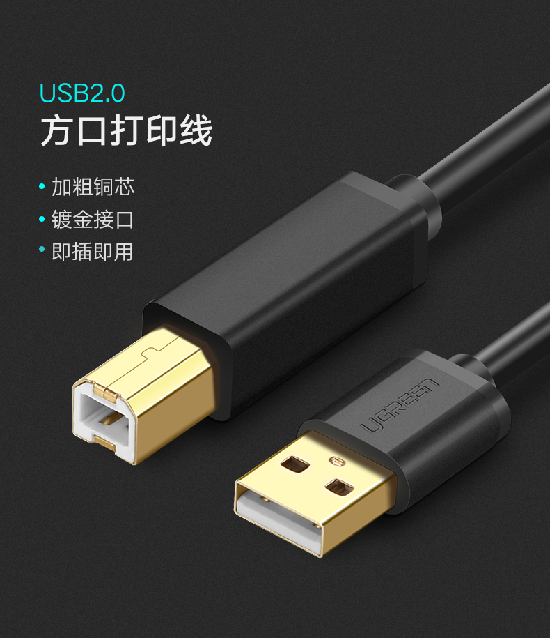 綠聯(lián) US135 USB2.0高速打印機數(shù)據(jù)線方口連接線鍍金接頭A公對B公 3米 黑色 單位:根