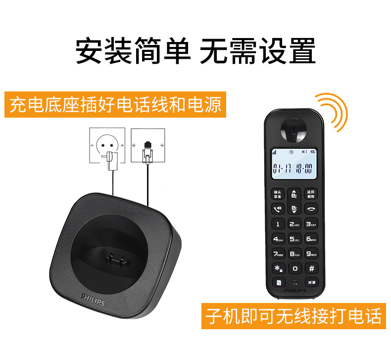 飛利浦電話 DCTG160 數(shù)字無繩電話機(jī)無線固話座機(jī)子母機(jī) 單機(jī) 紅色 單位:套