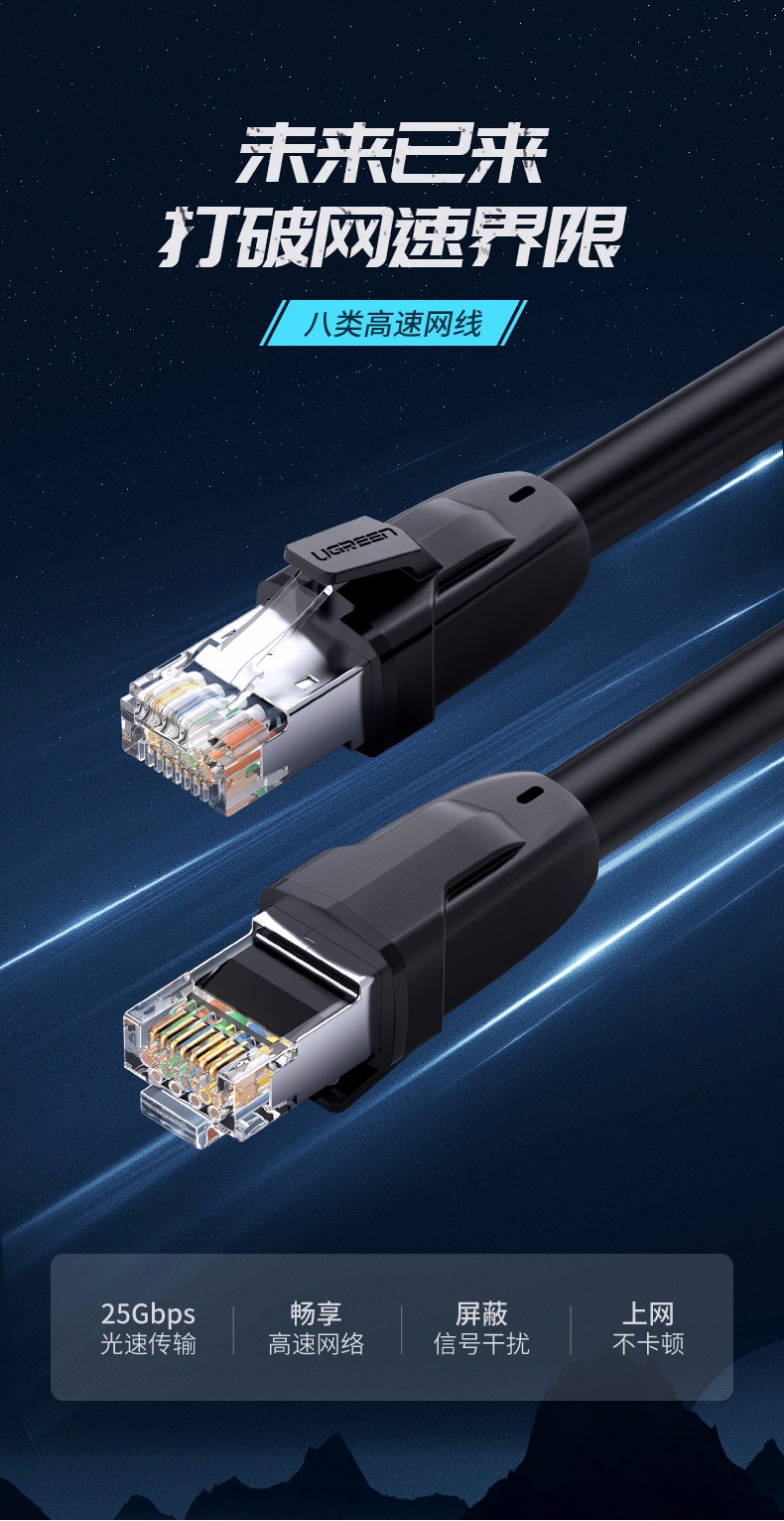 綠聯(lián) NW121 八類網(wǎng)線 游戲電競(jìng)版CAT8類八芯雙絞純銅鍍金雙屏蔽高速萬(wàn)兆網(wǎng)絡(luò)跳線 電腦家用寬帶成品監(jiān)控連接線 2米 黑色 單個(gè)裝