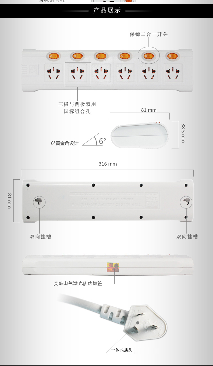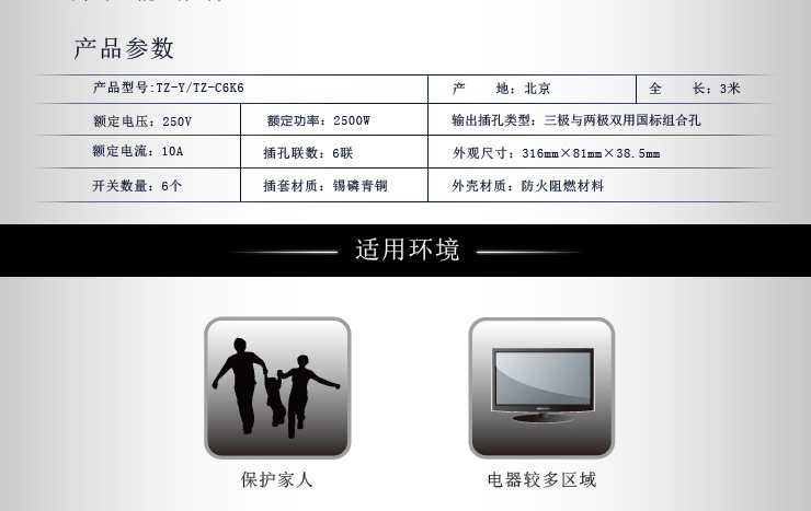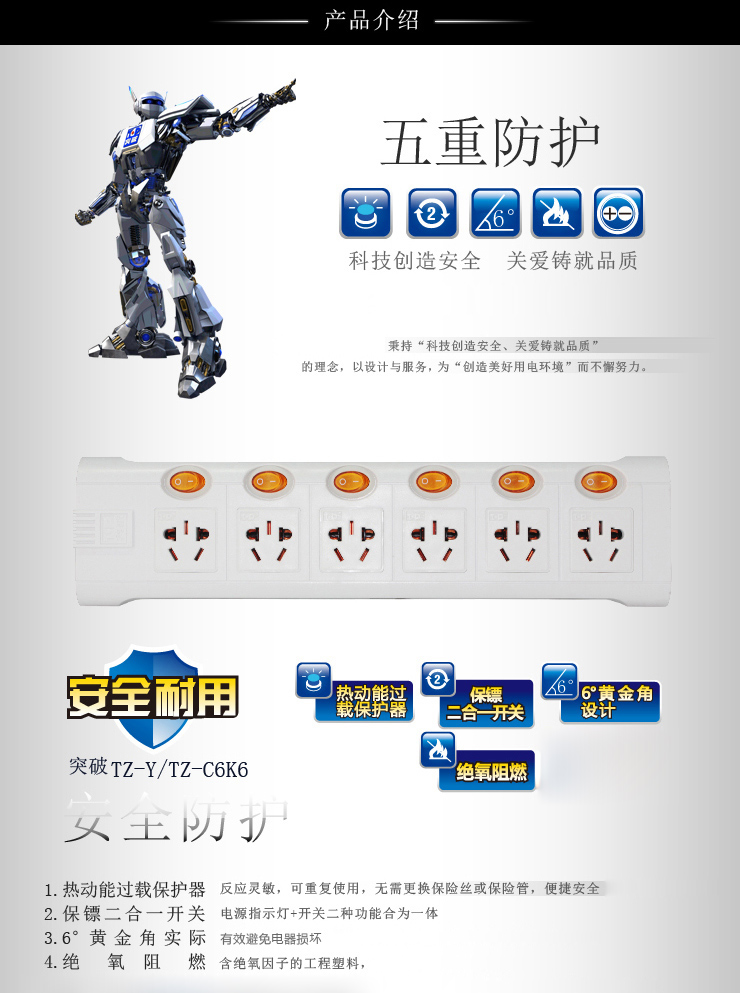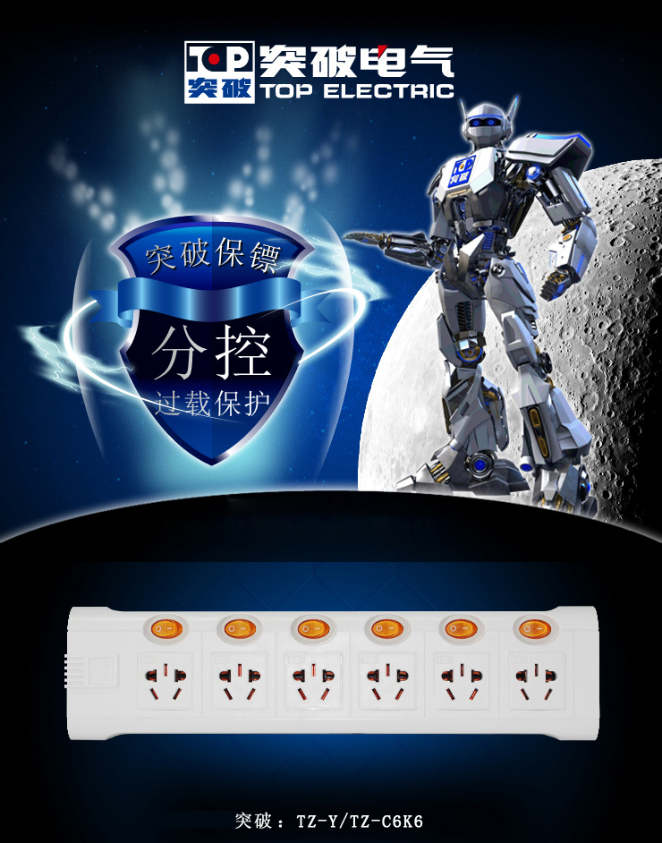 突破 TZ-D6K6 插座獨(dú)立開關(guān) 接線板 過載保護(hù) 6孔拖線板 10米
