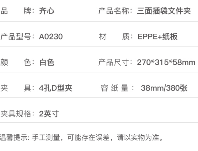 齊心4孔D型文件夾 A0230 白 單位:個(gè)