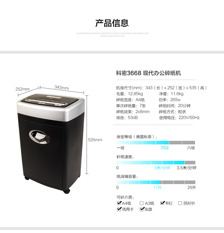 科密碎紙機(jī) 3668高保密碎紙機(jī) 單位:臺(tái)