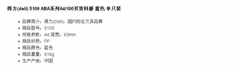 得力(deli) 5109 A4/100頁 資料冊/文件冊 ABA系列 藍色 單只裝