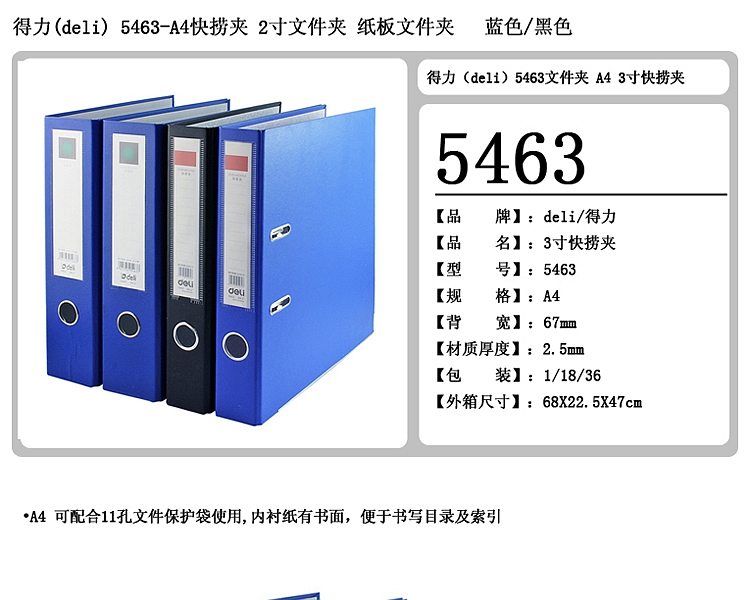 得力(deli) A4/3英寸PVC快勞夾5463快勞夾65mm背寬(黑)(只)
