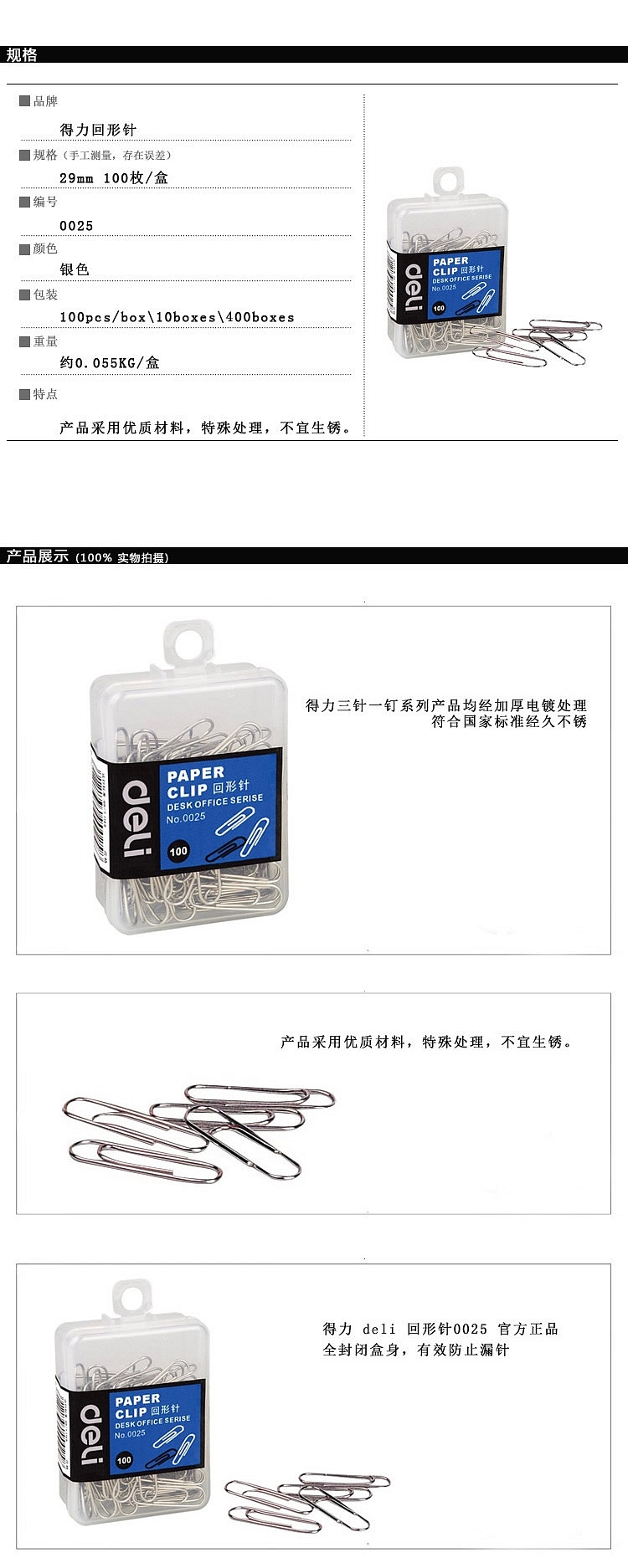 得力回形針 0025 銀色回形針 100枚曲別針 單位:盒