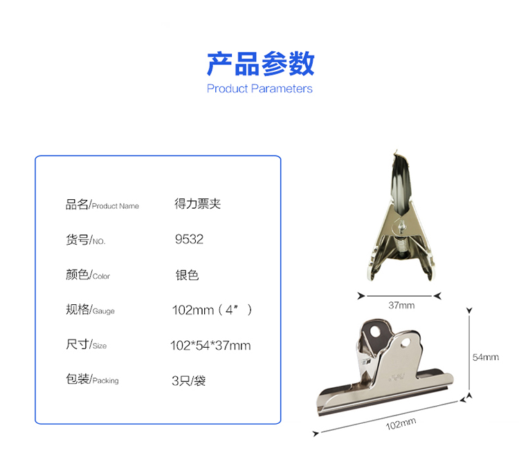 得力(deli)9532 102mm山形鐵票夾 3只/袋