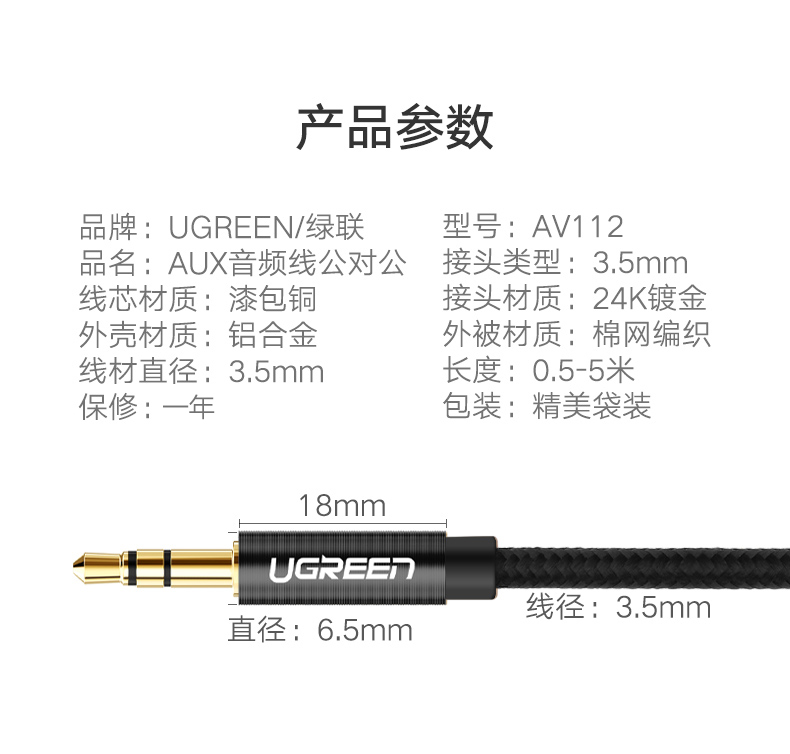 綠聯(lián) AV112 AUX車用音頻線3.5mm公對公立體聲耳機(jī)連接線 1米 黑色 單位:根