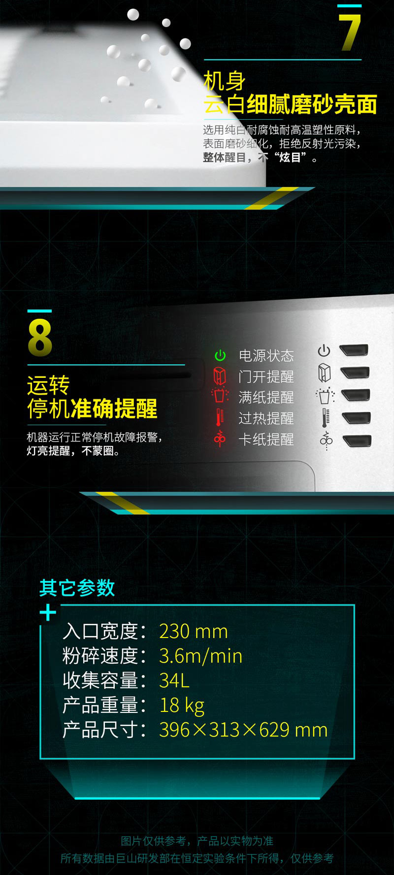 生產(chǎn)制造系中國(guó)保密協(xié)會(huì)會(huì)員單位 安全保護(hù)入紙擋板全面安全 滿紙門開多種運(yùn)行狀態(tài)LED顯示 光盤分類回收 PWM電流控制確保電機(jī)超靜音