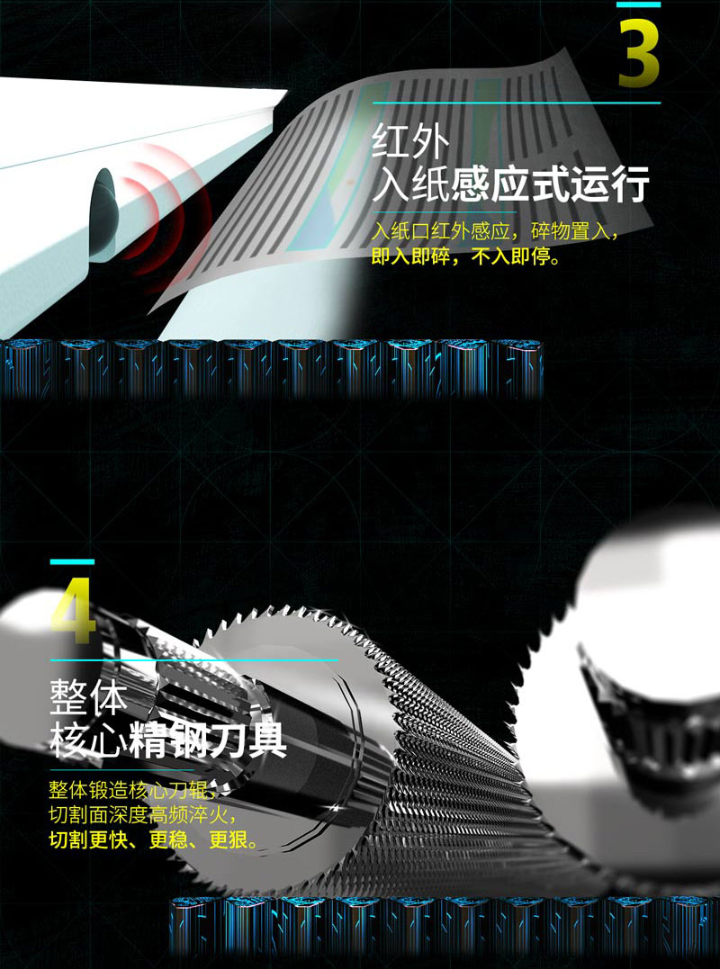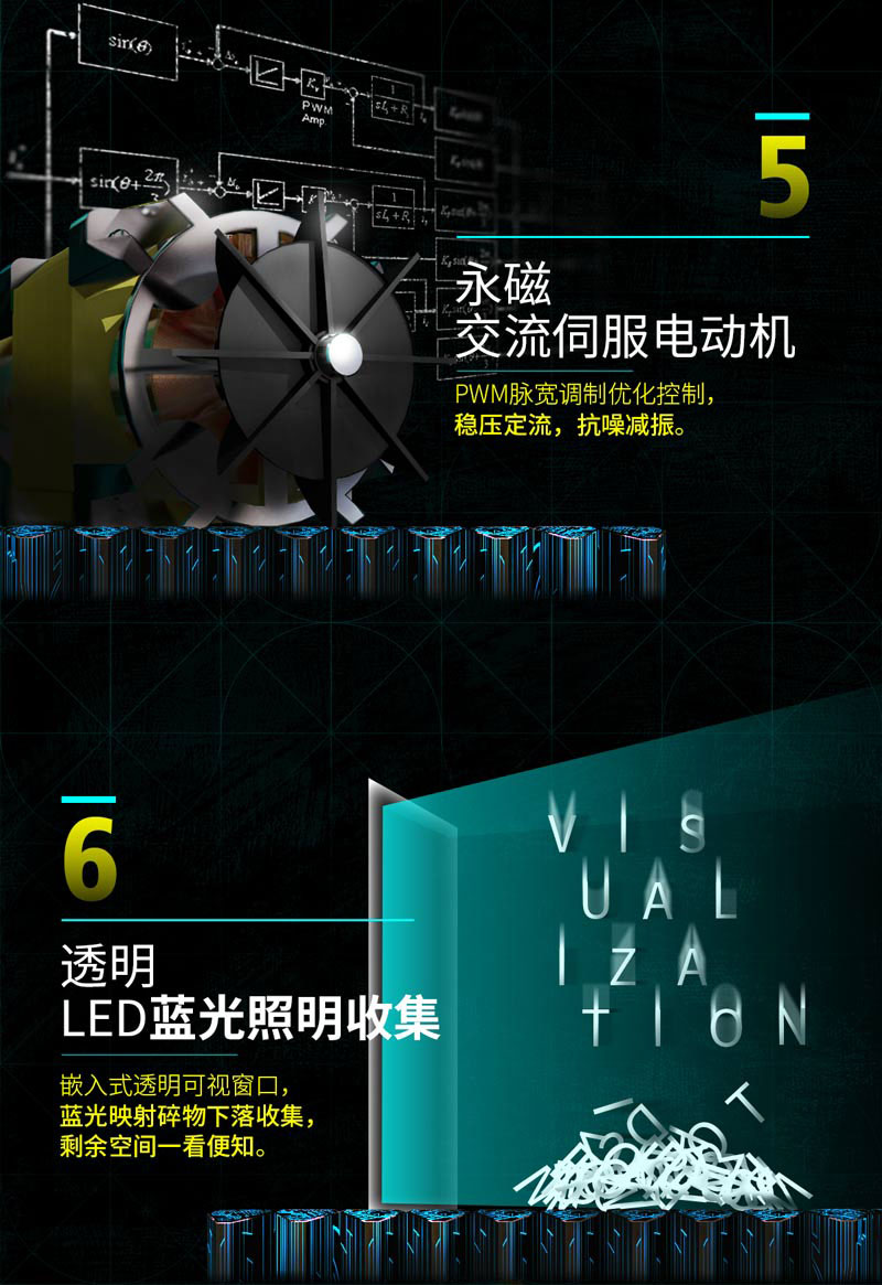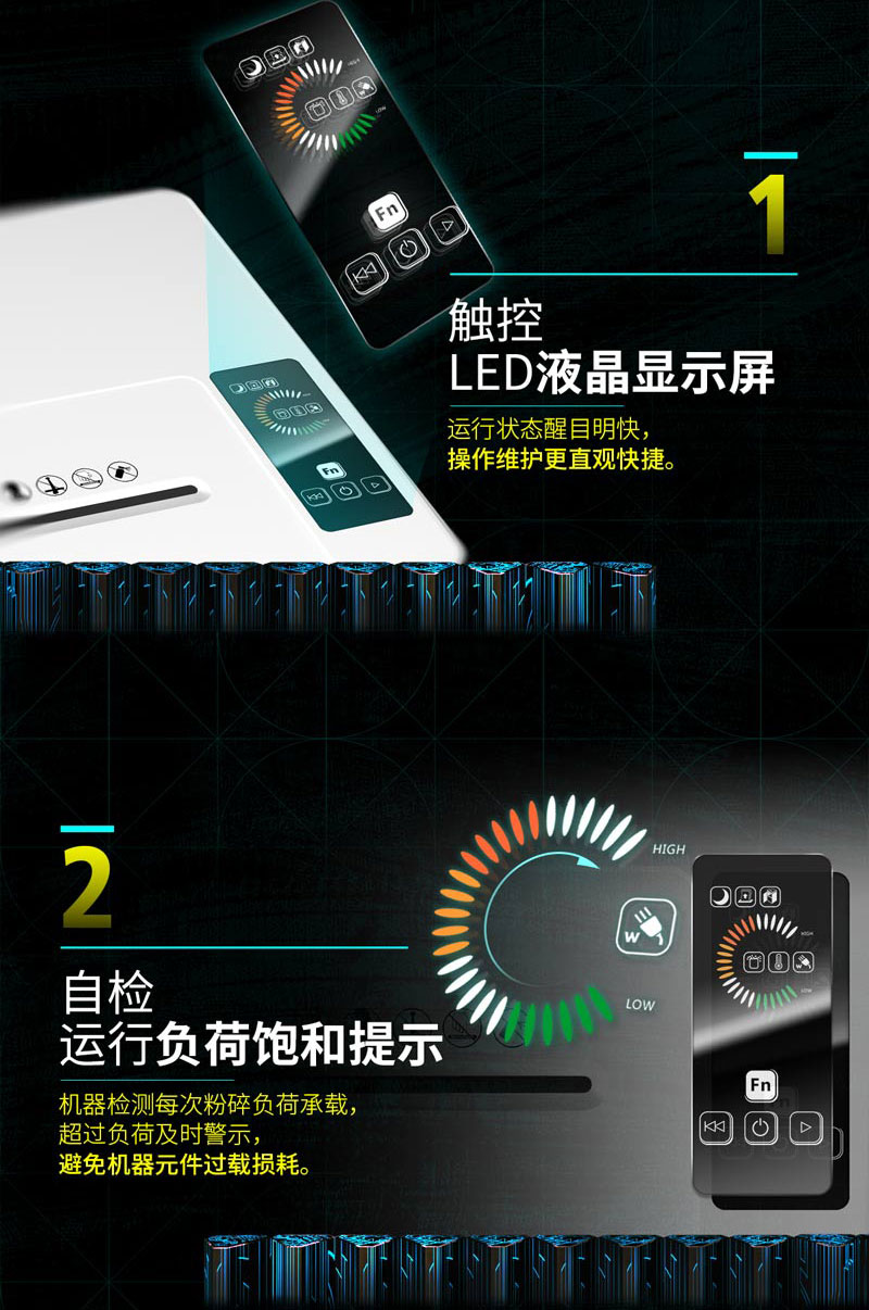 粉碎耗能觸屏顯示 卡紙自動反轉(zhuǎn)保護 具有LED觸屏顯示運行自檢功能 收集箱內(nèi)置LED藍(lán)光顯示 門開過熱卡紙觸屏顯示