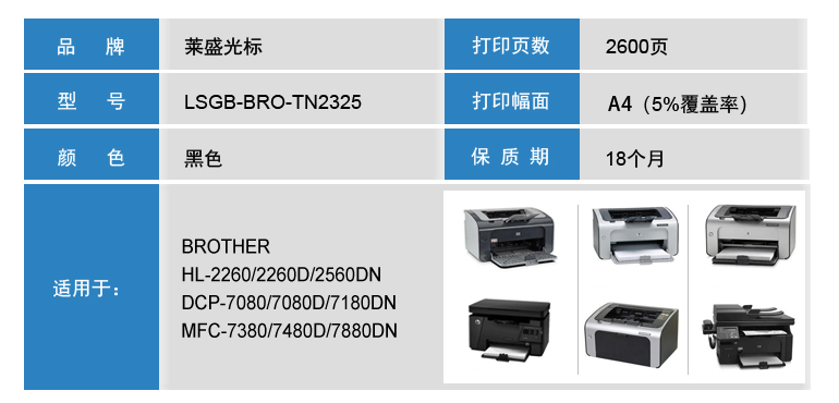 萊盛光標(biāo) LSGB-BRO-TN2325 黑色粉盒 適用:BROTHER HL-2260/2260D/2560DN 單位:支