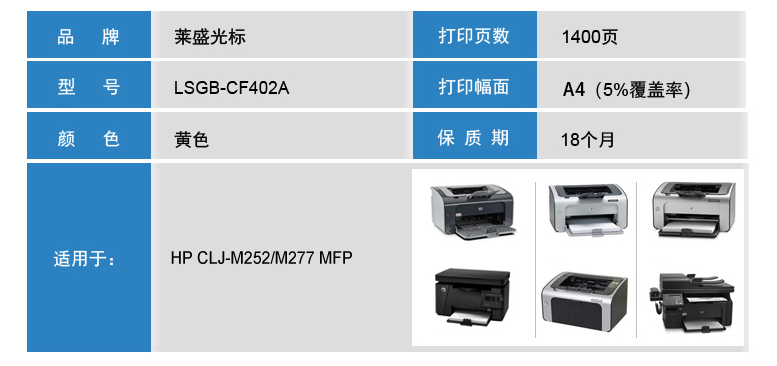 萊盛光標(biāo) LSGB-CF402A 黃色粉盒 適用:HP CLJ-M252/M277 MFP 單位:支