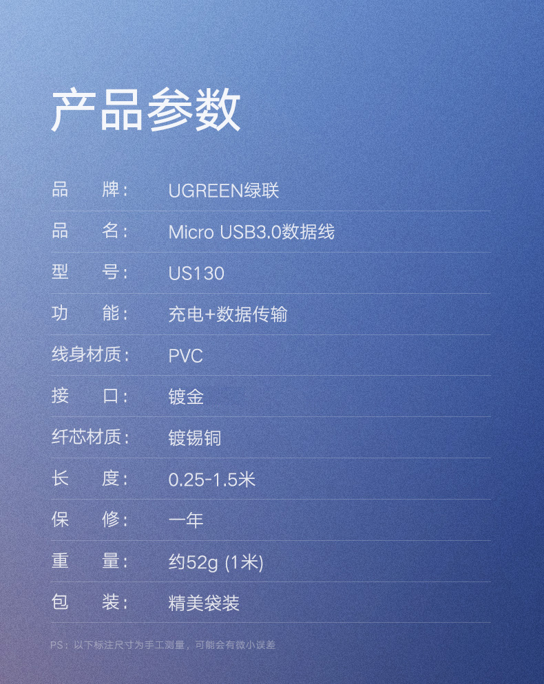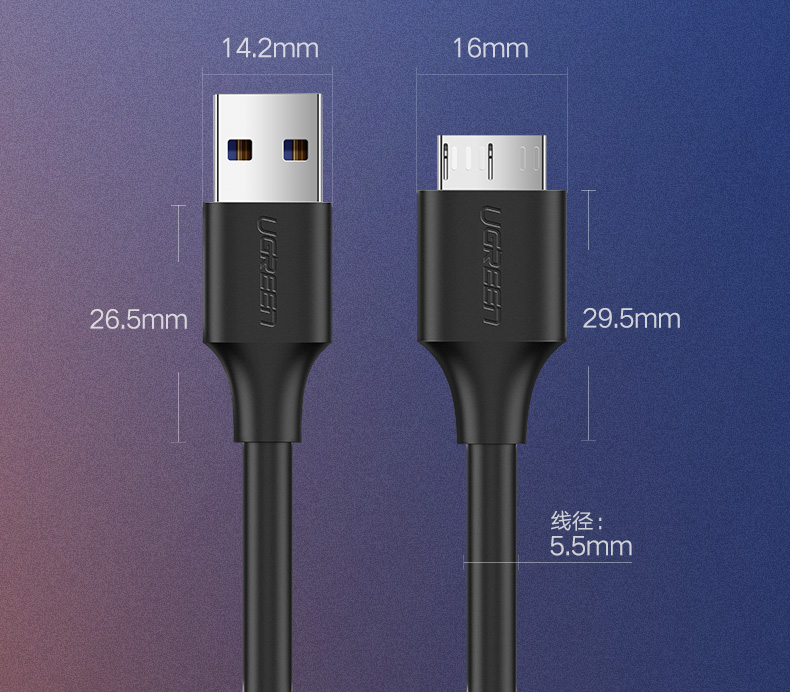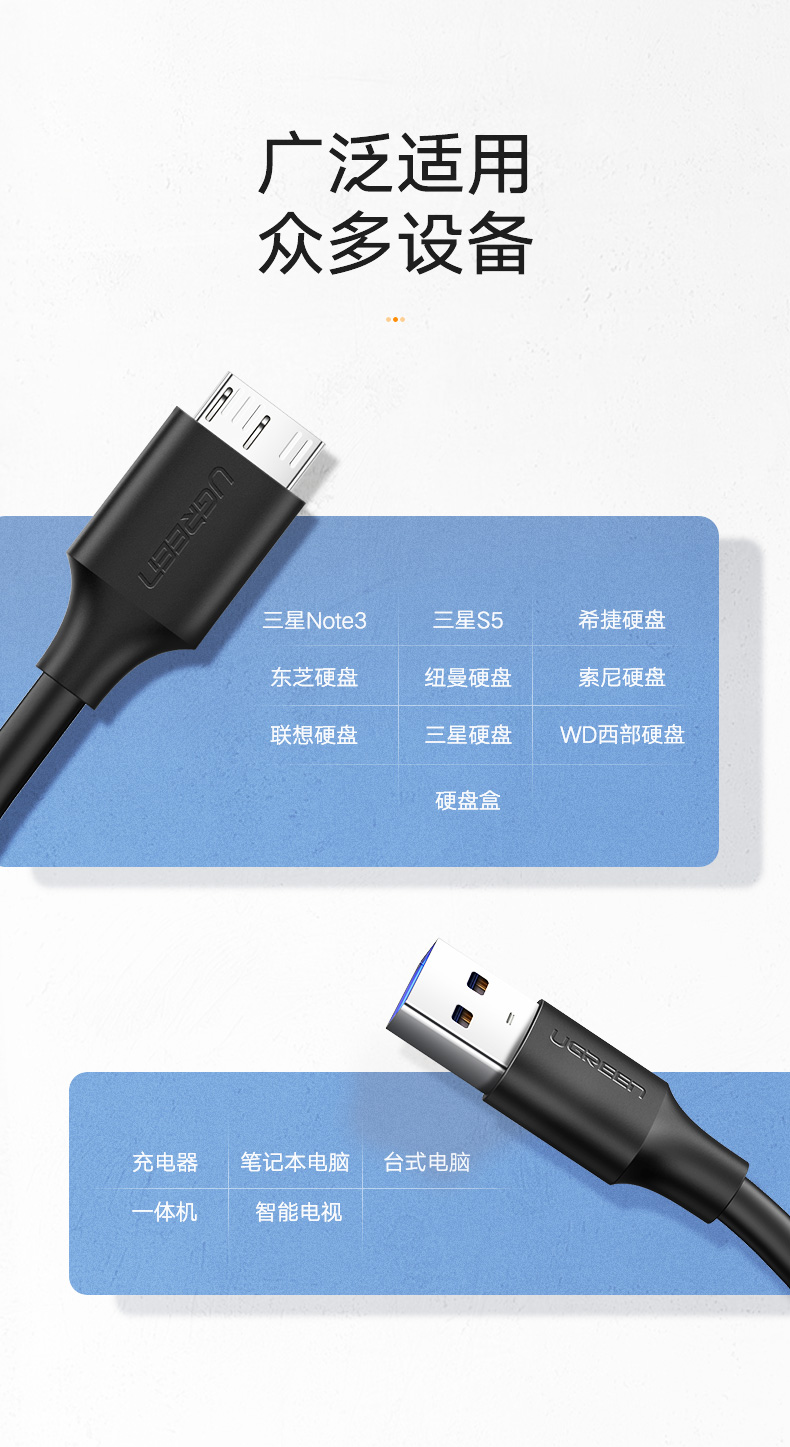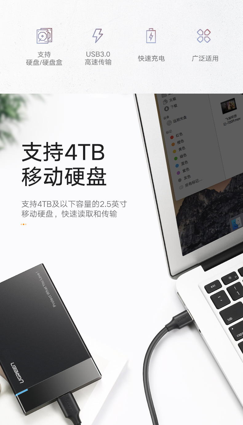綠聯(lián) US130 數(shù)據(jù)連接線 Micro USB3.0高速傳輸 移動硬盤盒子轉(zhuǎn)接線 1米 黑色 單位:根