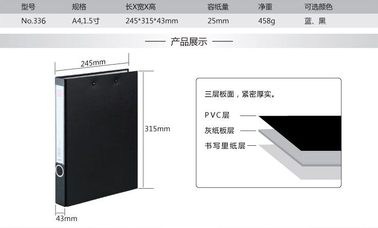 商品名稱:齊心 NO.336 辦公必備紙板夾 A4 1.5寸 2孔 基本單位:個