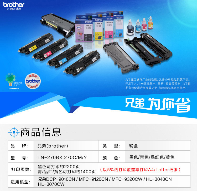 兄弟墨粉 TN-270C 青色粉盒 適用:機(jī)型HL-3040CN/3070C MFC-9320CW/9120CN 1DCP-9010CN 單位:支