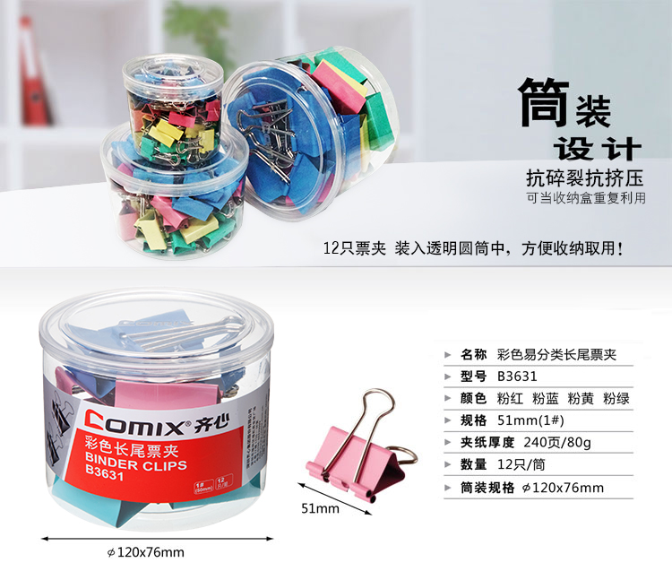 齊心(Comix) B3631 彩色長尾夾 單位:筒