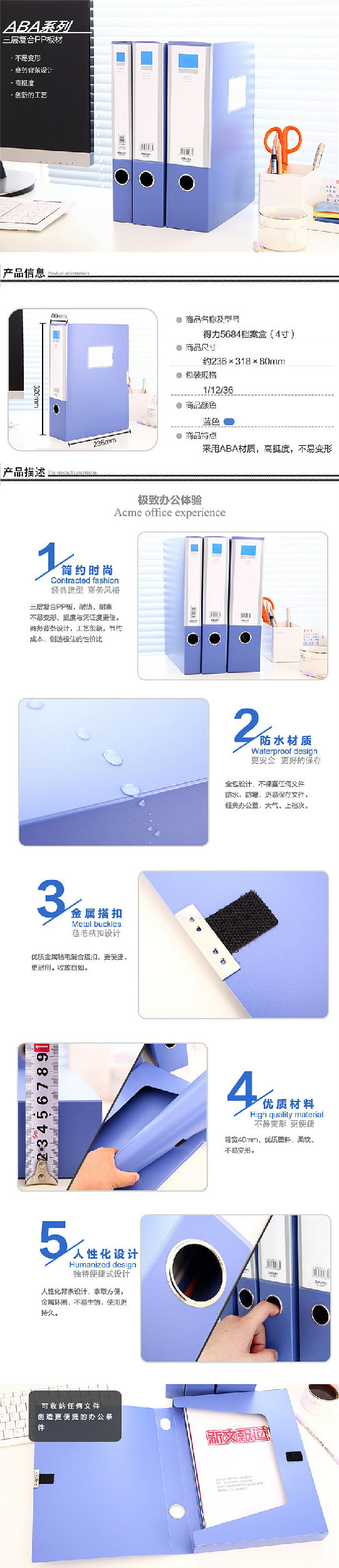 商品名稱(chēng):得力(deli) 5684 ABA系列A4/75mm檔案盒 藍(lán)色 單只裝