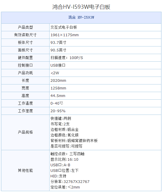 鴻合 HV-I593W 電子白板 單位:臺(tái)