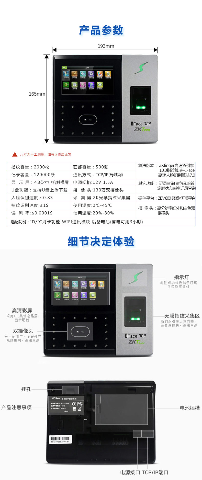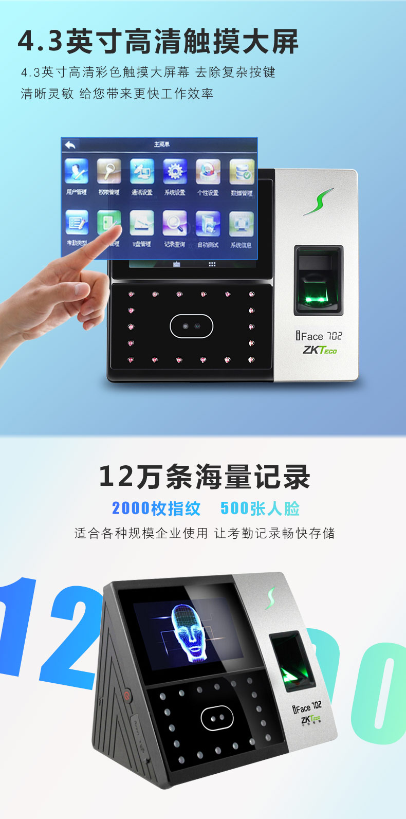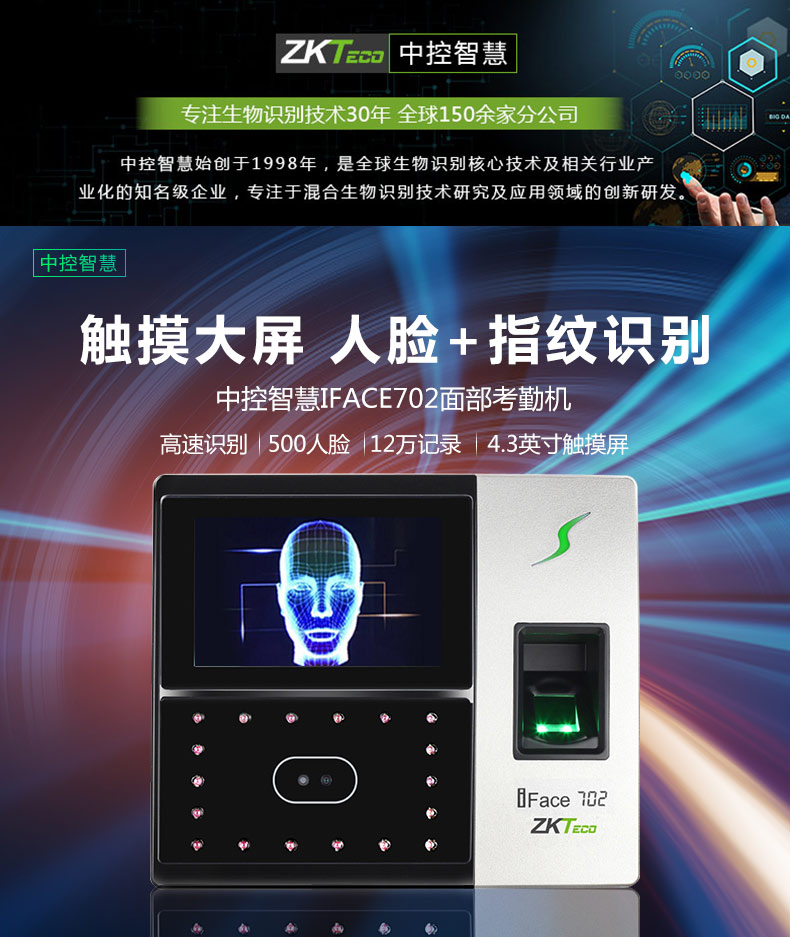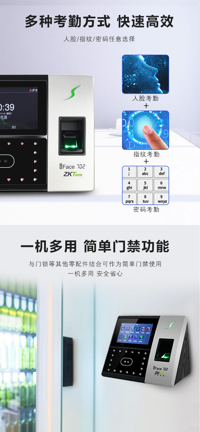 中控智慧考勤機(jī) iFace702 人臉指紋考勤機(jī) 觸屏操控門禁一體機(jī) 單位:臺(tái)