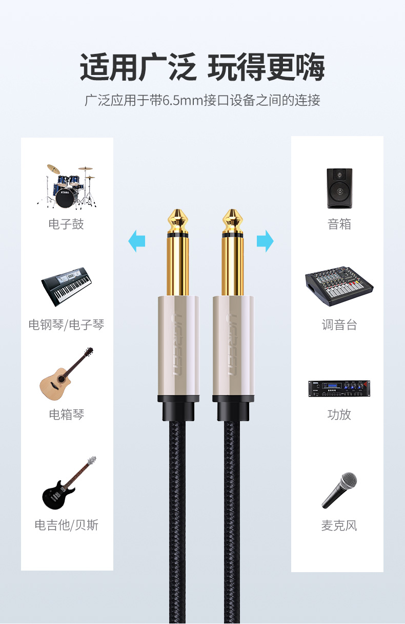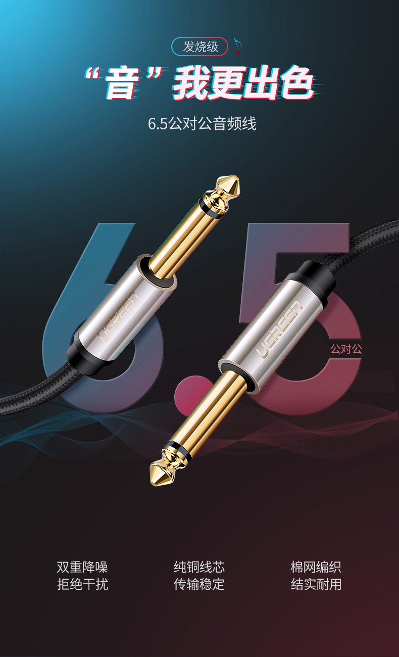 綠聯(lián) AV128 6.5mm音頻線6.35大二芯公對公連接線線 棉網(wǎng)編織 1.5米 黑色 單位:根