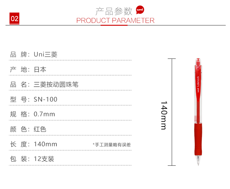 三菱 SN-100 0.7mm按動圓珠筆辦公用原子筆 紅色 12支/盒