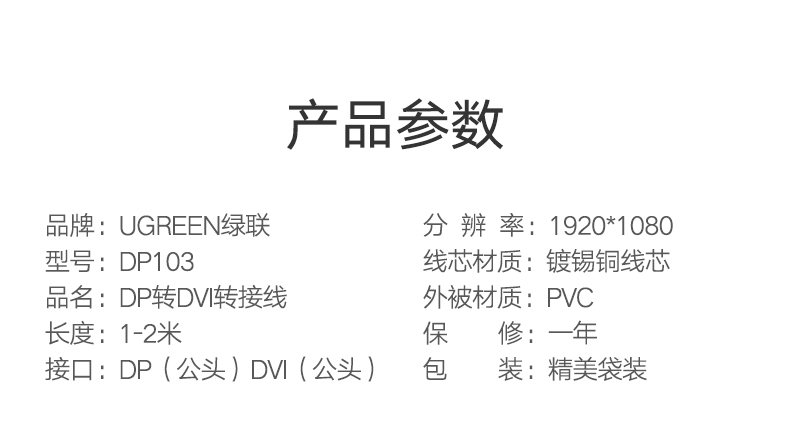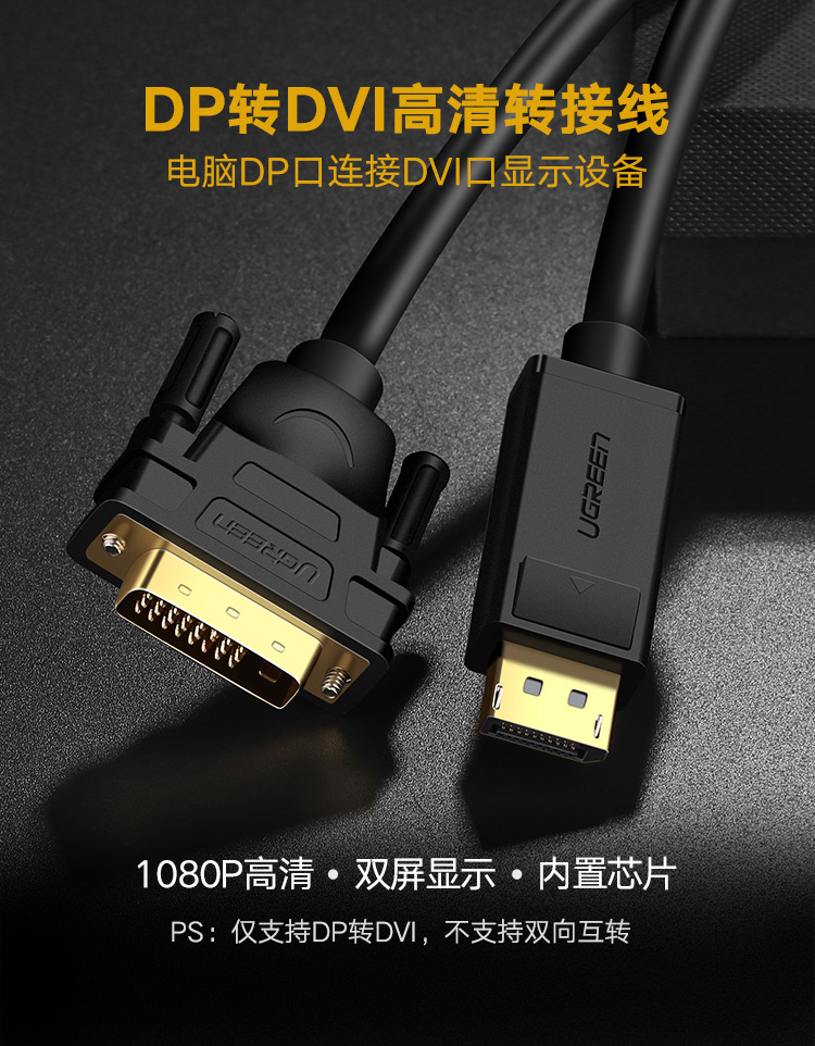 綠聯(lián) DP103 DP轉(zhuǎn)DVI轉(zhuǎn)換線 公對(duì)公高清轉(zhuǎn)接頭 電腦接顯示器投影儀連接線 1.5米 黑色 單個(gè)裝