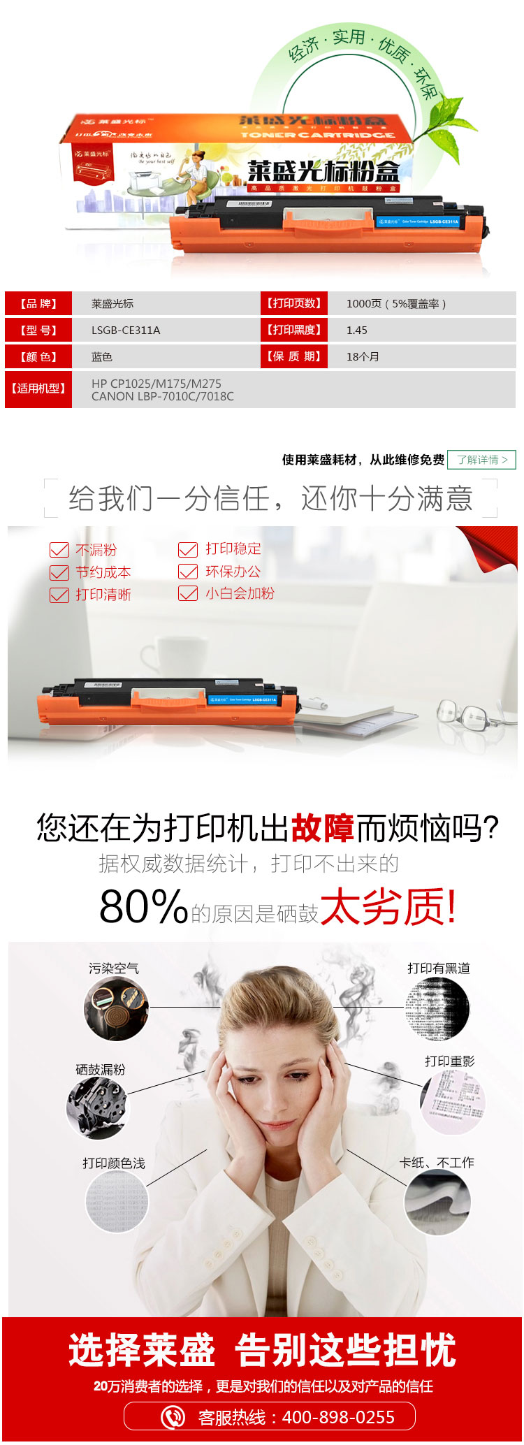 萊盛光標(biāo) LSGB-CE311A 青色粉盒 適用:HP CP1025/M175/M275 CANON LBP-7010C 單位:支
