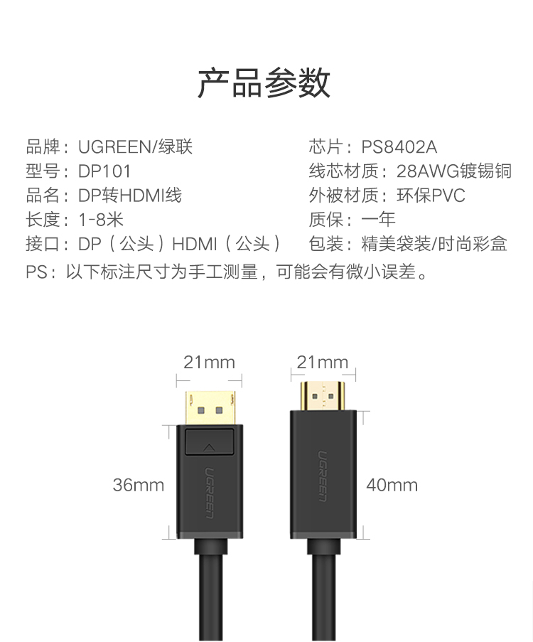 綠聯(lián) DP101 DP轉(zhuǎn)HDMI轉(zhuǎn)接線 4K高清連接線 1.2版 DisplayPort轉(zhuǎn)hdmi公對(duì)公 電腦電視視頻轉(zhuǎn)換線 5米 單個(gè)裝