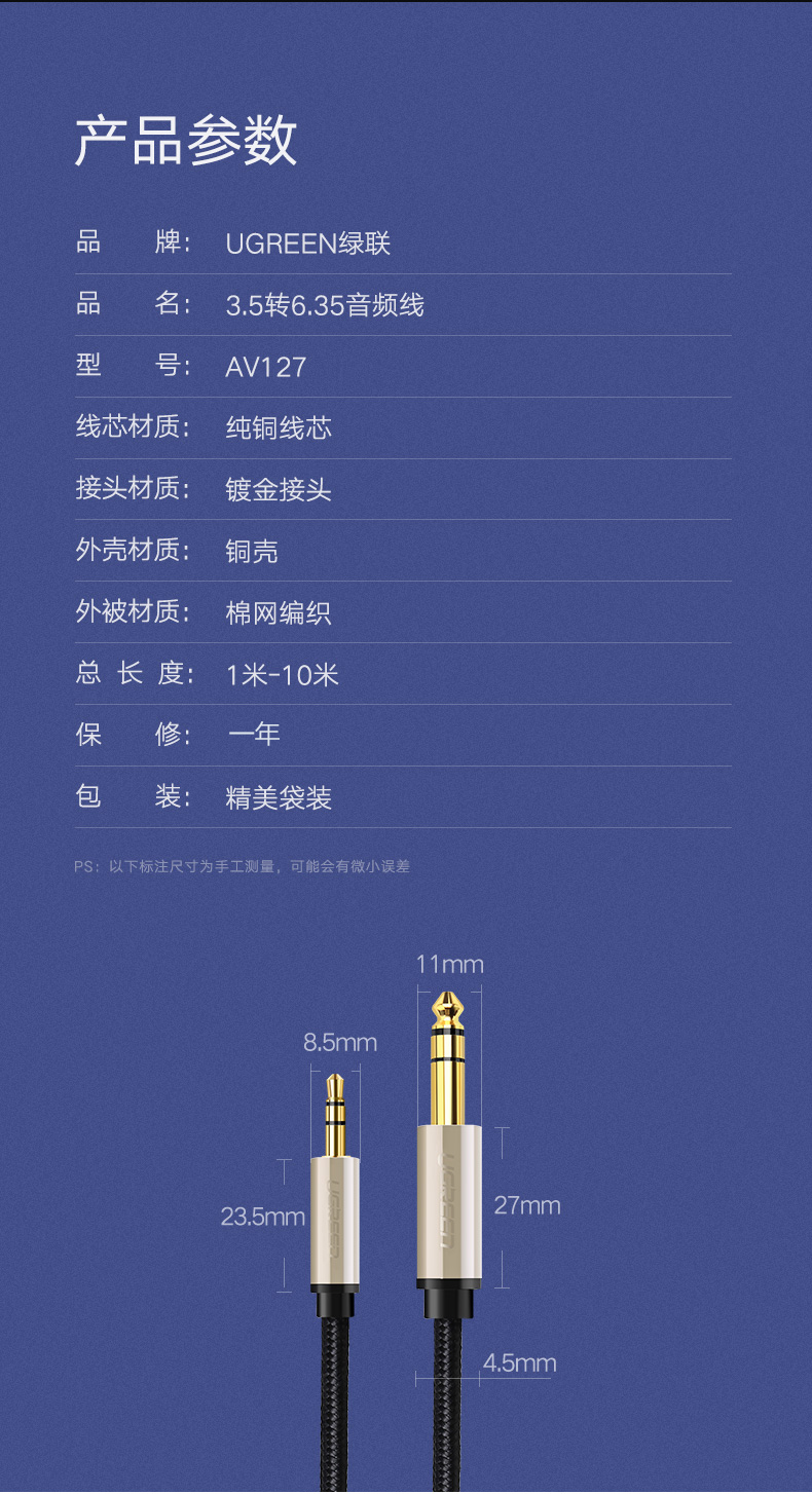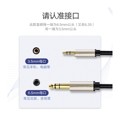 綠聯(lián) AV127 3.5mm轉(zhuǎn)6.5mm公對(duì)公音頻線 手機(jī)筆記本電腦音響箱連接線 6.35功放調(diào)音臺(tái)電吉他轉(zhuǎn)換線 棉網(wǎng)編織 2米 黑色 單個(gè)裝