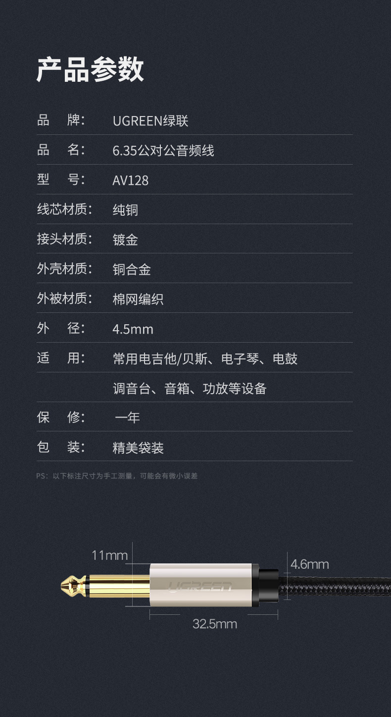 綠聯(lián) AV128 6.5mm音頻線6.35大二芯公對公連接線對錄線 音響音箱功放麥克風電吉他電子琴鼓調(diào)音臺轉(zhuǎn)接線 棉網(wǎng)編織 2米 黑色 單個裝
