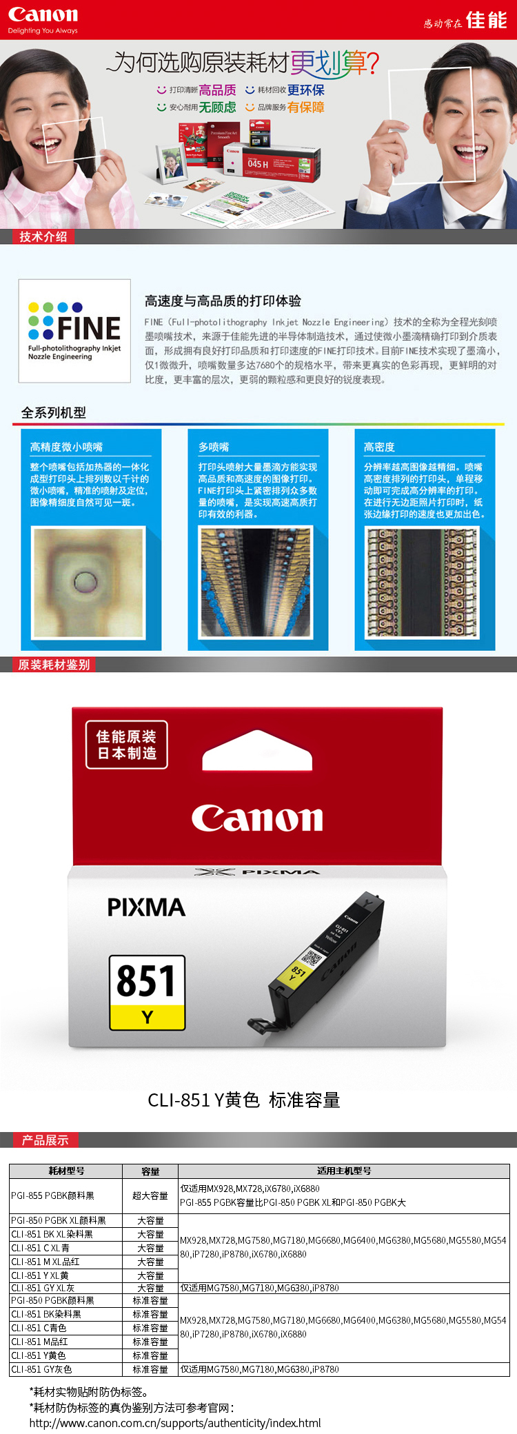 佳能(Canon)CLI-851 黃色墨盒 適用IP7280/MX728/928/IX6780/6880/MG6380/MG5480