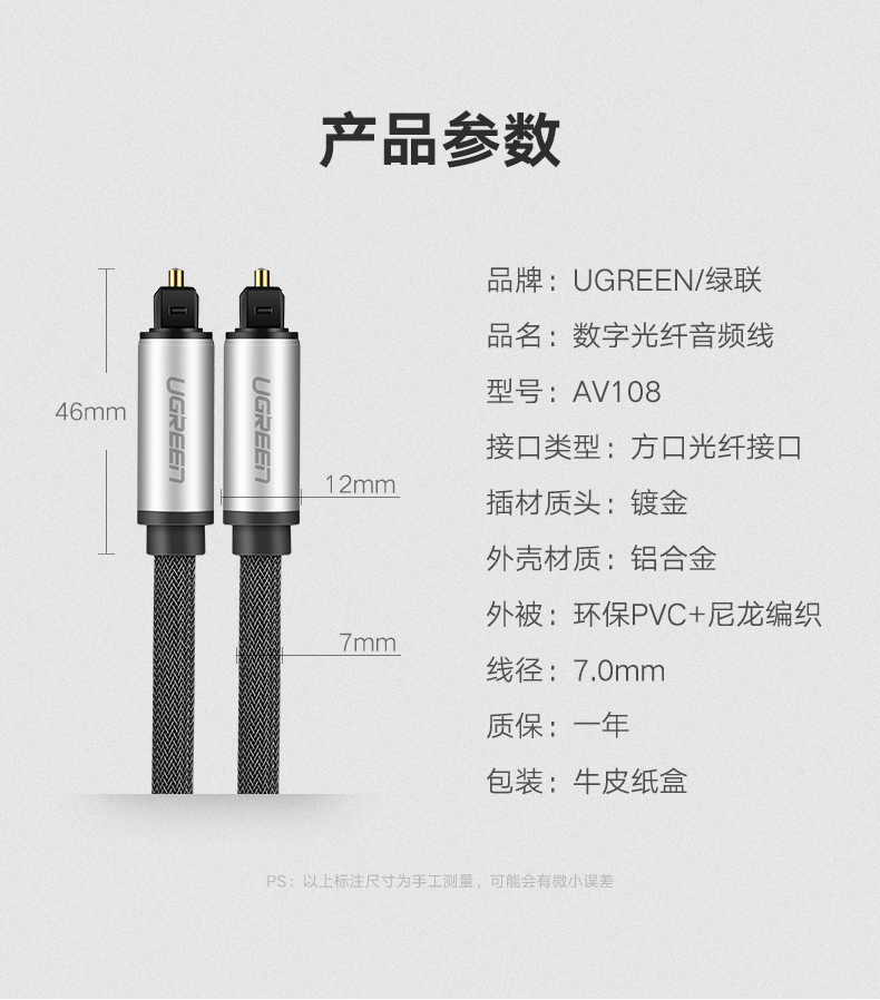 綠聯(lián) AV108 光纖音頻線SPDIF數(shù)字輸出適用小米電視音箱方頭對(duì)方口5.1聲道功放音響光纖連接線AV108 2米 黑色 單個(gè)裝