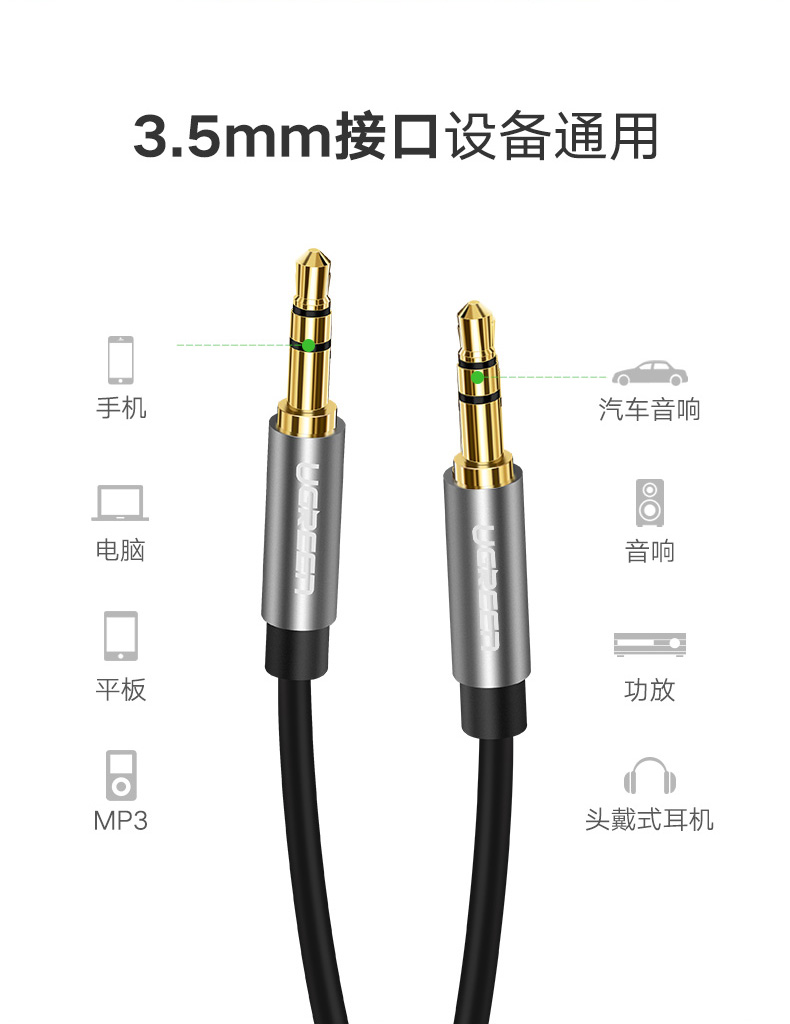 綠聯(lián) AV119 AUX車載音頻線 扁線 手機(jī)、MP3/4接音箱音頻線 黑色直頭對(duì)彎頭90度 1米 黑色 單個(gè)裝