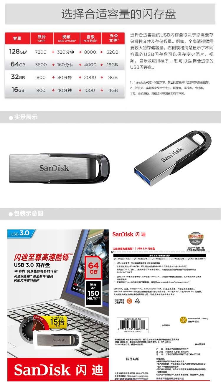 閃迪U盤 CZ73 USB3.0 64GB 單位:個(gè)