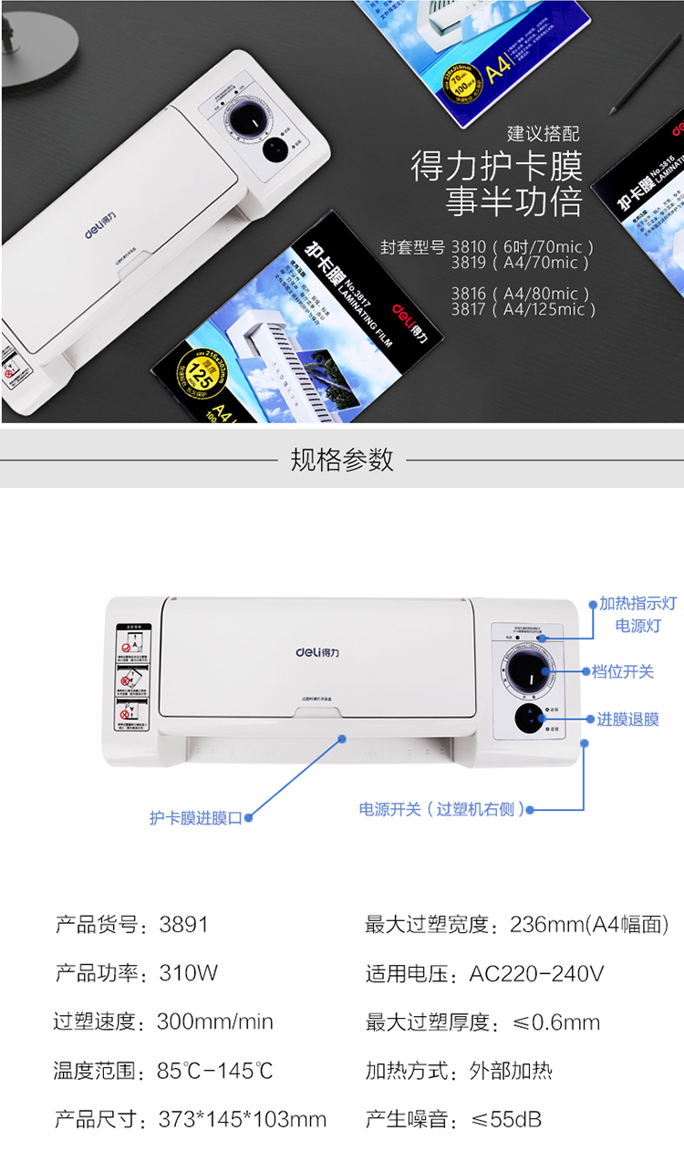得力塑封機 3891 A4塑封機雙向電機 單位:臺
