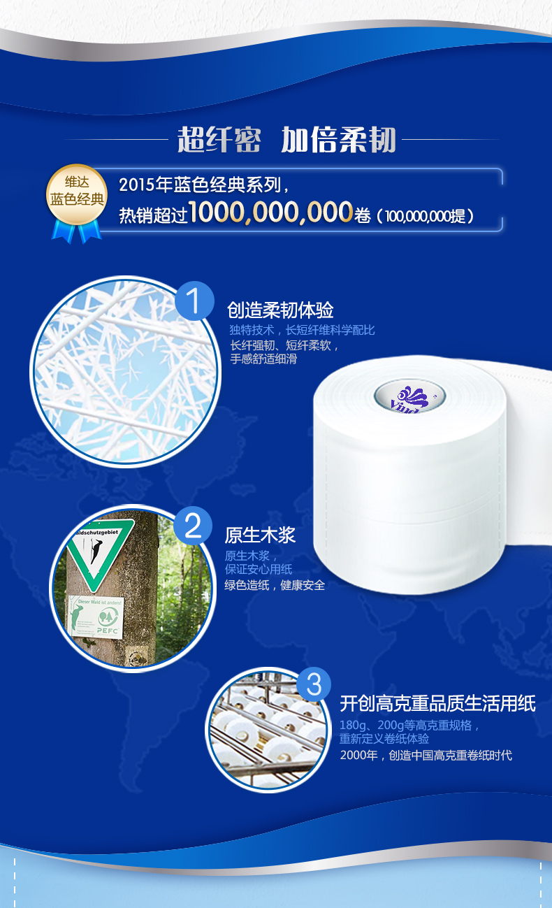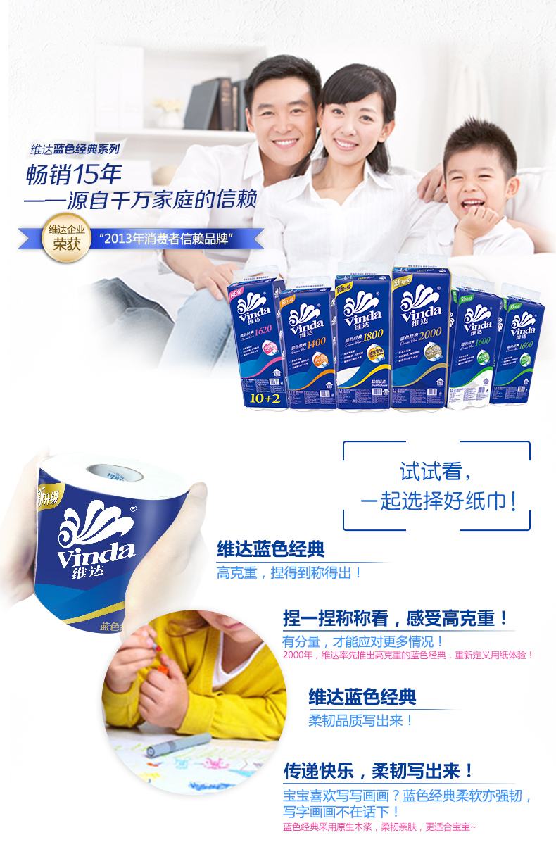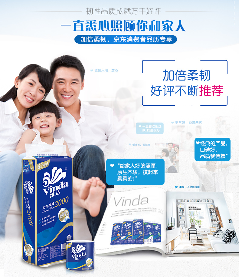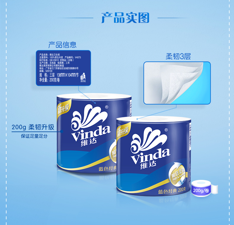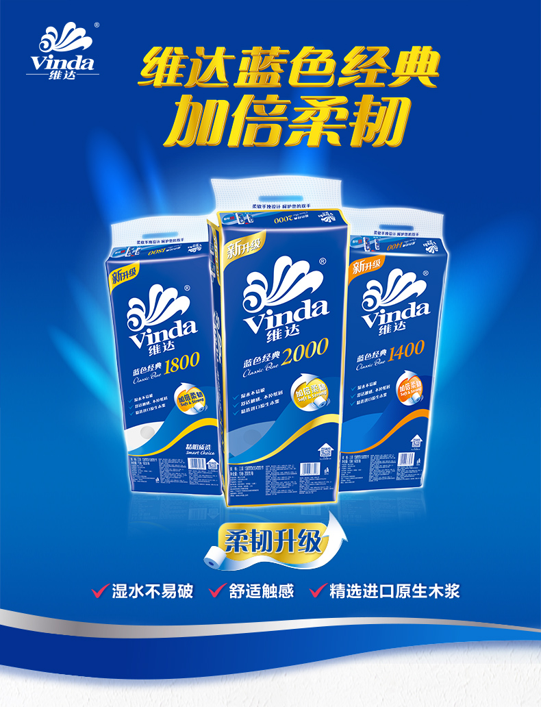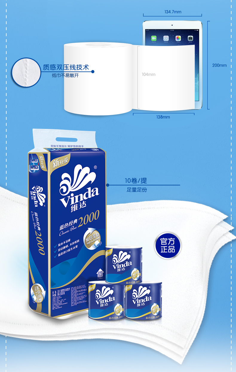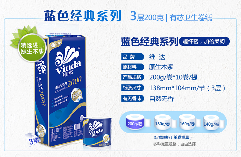 維達卷紙 藍色經(jīng)典系列3層200g有芯卷紙 單位:10卷/提