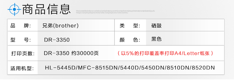 兄弟硒鼓 DR-3350 適用:機(jī)型:HL-5440D/5445D/5450DN/6180DW/MFC-8510DN/8515DN/8520DN 單位:支